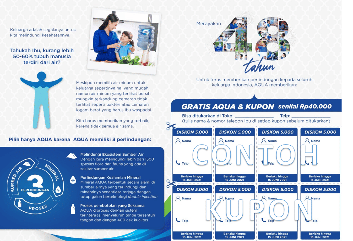 Dalam rangka merayakan 48 tahun telah hadir di Indonesia, AQUA mengadakan program promosi gratis galon AQUA dan voucher yang bisa Ibu tukarkan di toko terdekat. AQUA berharap program ini dapat membantu Ibu Indonesia memenuhi kebutuhan hidrasi keluarga selama masa sulit ini melalui voucher potongan harga yang didapatkan.