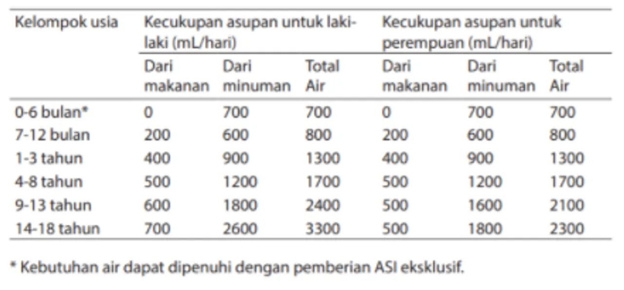 Penelitian yang telah dilakukan di Indonesia menunjukkan rerata asupan air pada anak laki-laki dan perempuan usia 4-9 tahun secara berurutan adalah 1387 mL/hari dan 1394 mL/hari, sedangkan asupan air pada anak laki-laki dan perempuan usia 10-17 tahun secara berurutan adalah 1621 mL/hari dan 1589 mL/hari. (2)
