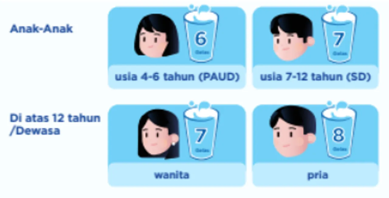 Sesuai anjuran dari Kementrian Kesehatan, kebutuhan air minum tergantung dari jenis kelamin, aktivitas, usia, berat badan dan kondisi fisik: